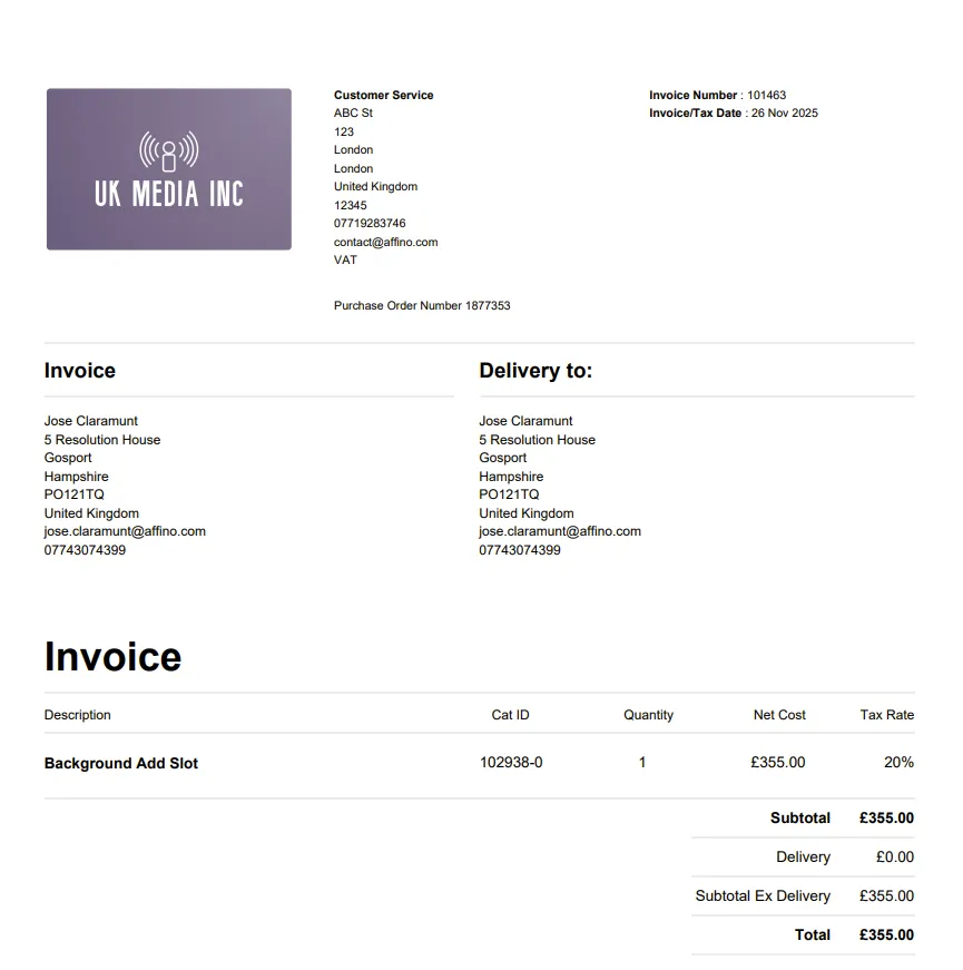 Additional Information: Enter any additional information required on the invoice This appears below the Total price