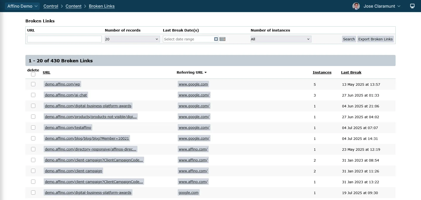 • Use the date range and instances filters to focus on the most critical broken links for your site.