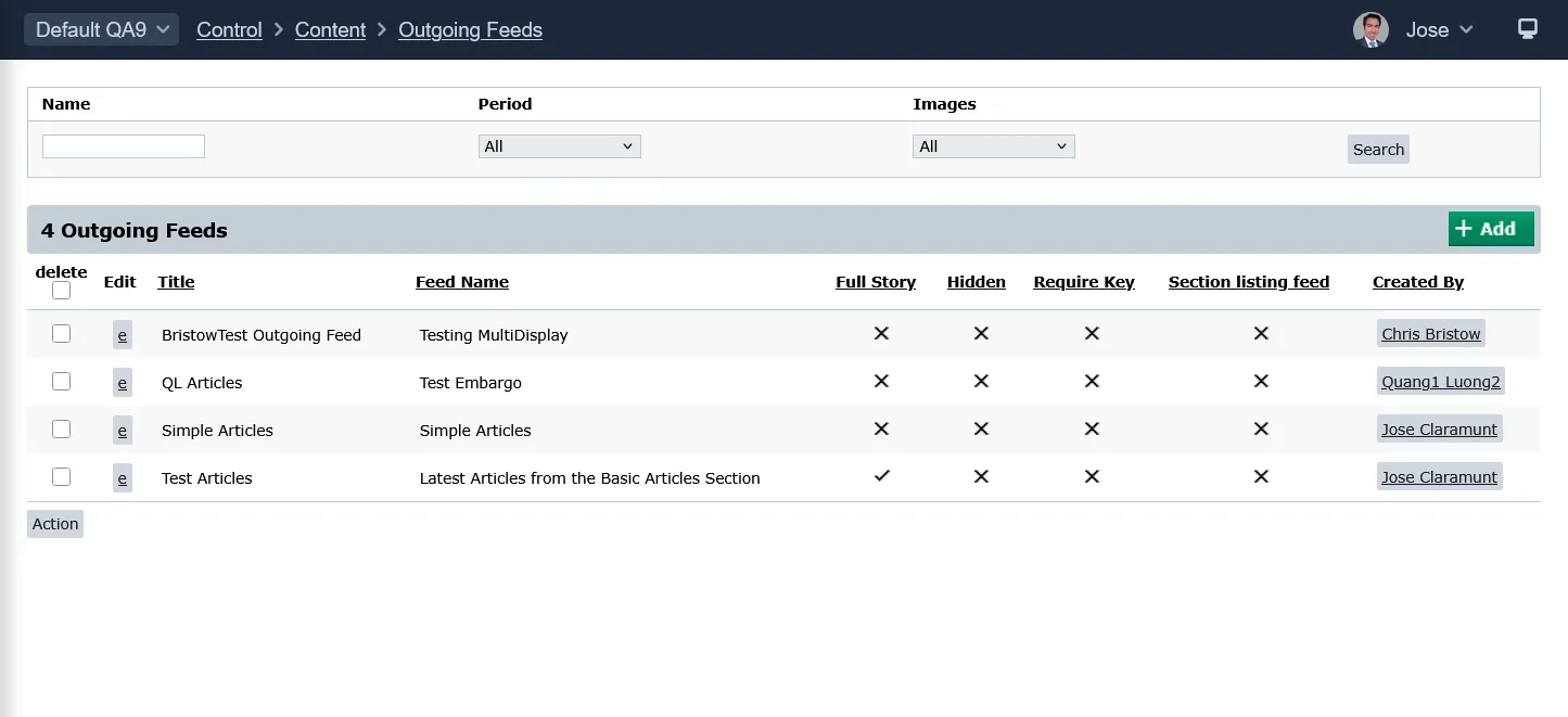 Control > Content > Outgoing Feeds