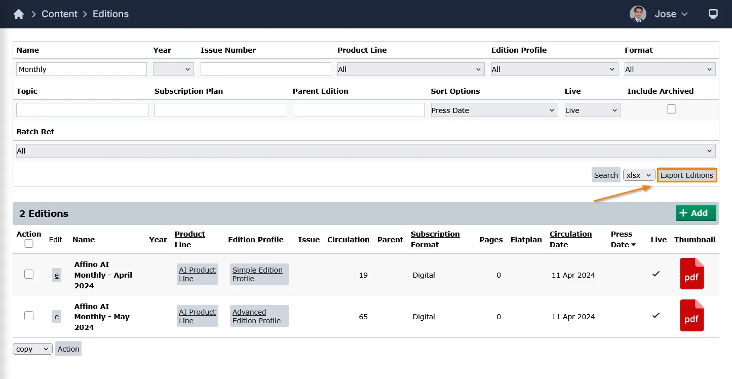 This feature allows you to export Editions based on the selected filters and search results.