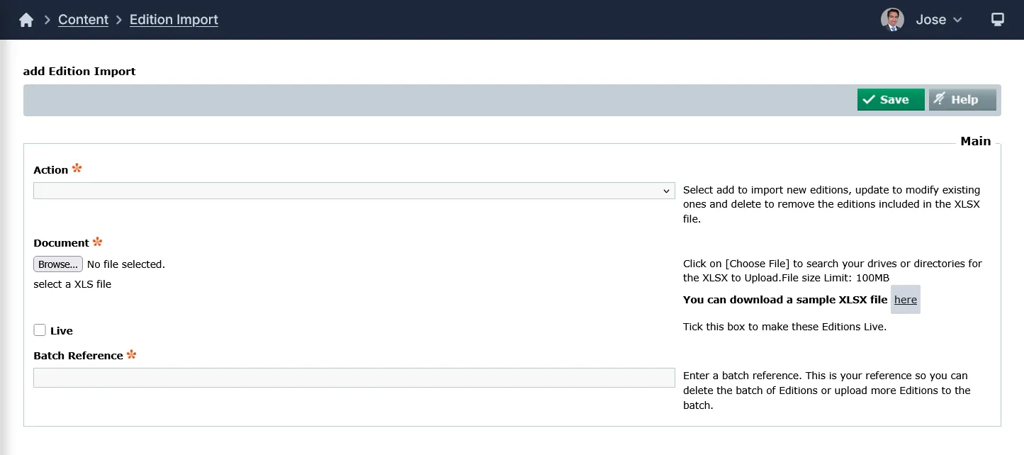 Action: Select Add to import new editions, Update to modify existing ones and Delete to remove the editions included in the XLSX file.