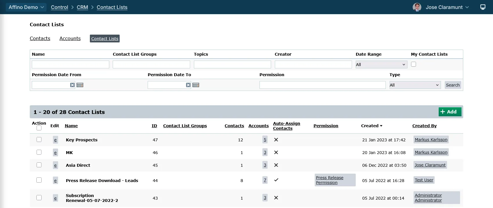 Contact Lists in Affino are dynamic groupings of contacts used for targeted communication, segmentation, and automation.