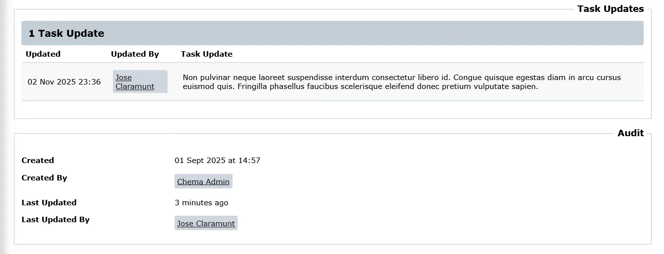 Each update to a task is logged automatically, preserving a full history with timestamps and user information, enabling collaborative workflows.
