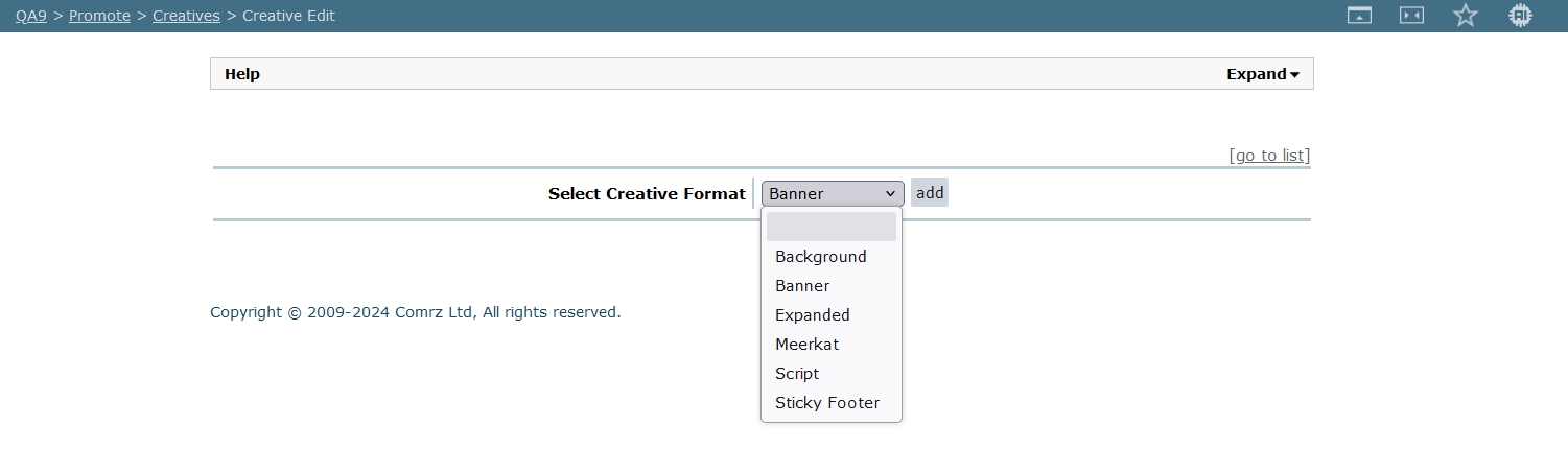 You can set up the following types of creatives by navigating to the Creatives listing screen and clicking on the Add button. Select the desired type then fill in the required fields and options:
