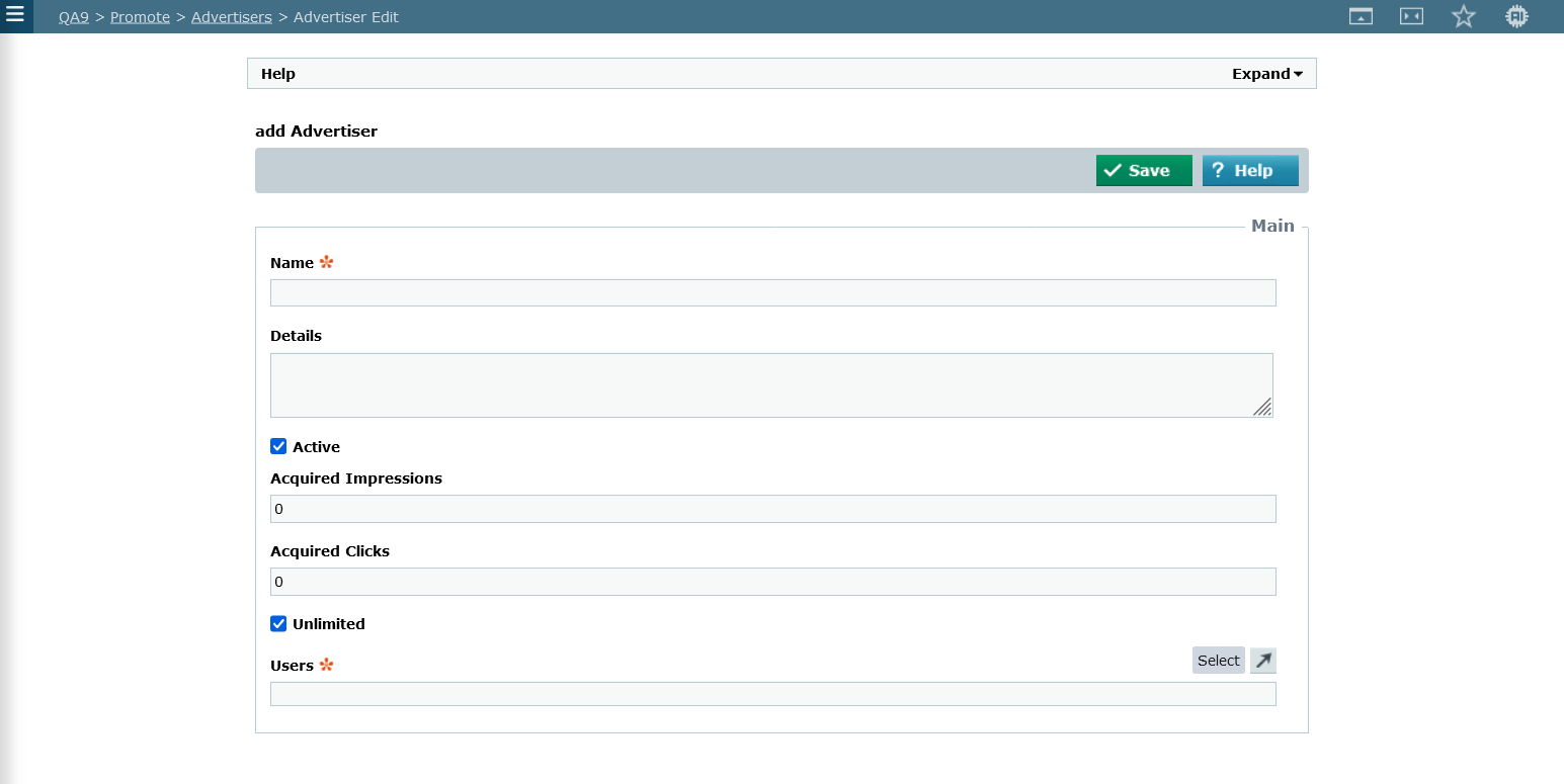 On the Advertiser detail screen you can set the amount of Impressions and Clicks allocated to that Advertiser. You can also activate or deactivate campaigns via the 'Active' tick box. Advertisers will have users that will access the Ad Campaign Analysis screen, you set those users on the Users field.