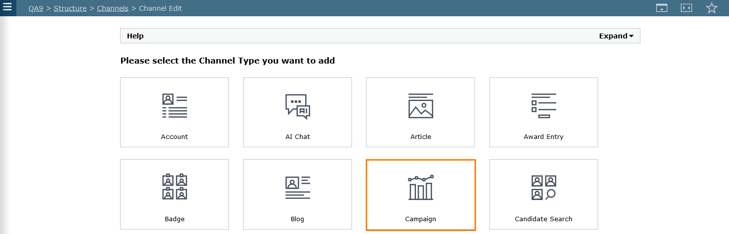 If not already created, you can add the channel just like any other by clicking on the Add button on the Channel listing screen and selecting the Campaign type channel.